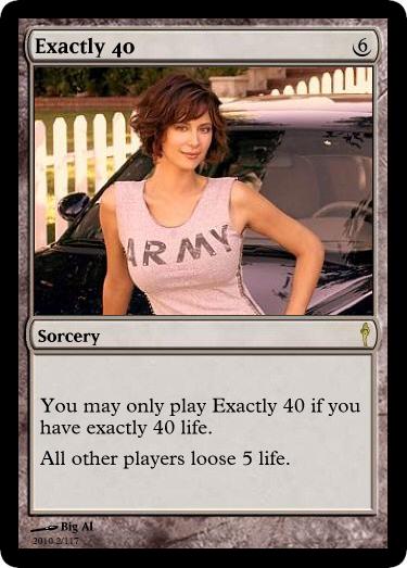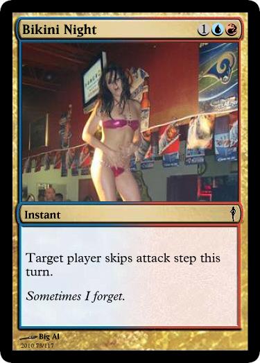 Ideas came from various phrases uttered during a game. These include Exactly 40 a joke about the very high life totals in one game and, Bikini Night that was made after a night of cards during bikini night at HotShotz. I discovered that there were pictures from bikini night available.