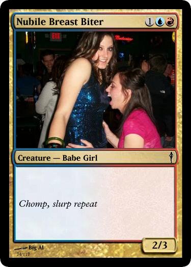 The next cards created to make some fun cards from some Facebook pictures. These include Defenseless, Thirteen and Nubile Breast Biter. There were about a dozen cards in the set and Ben suggested I make a whole set.